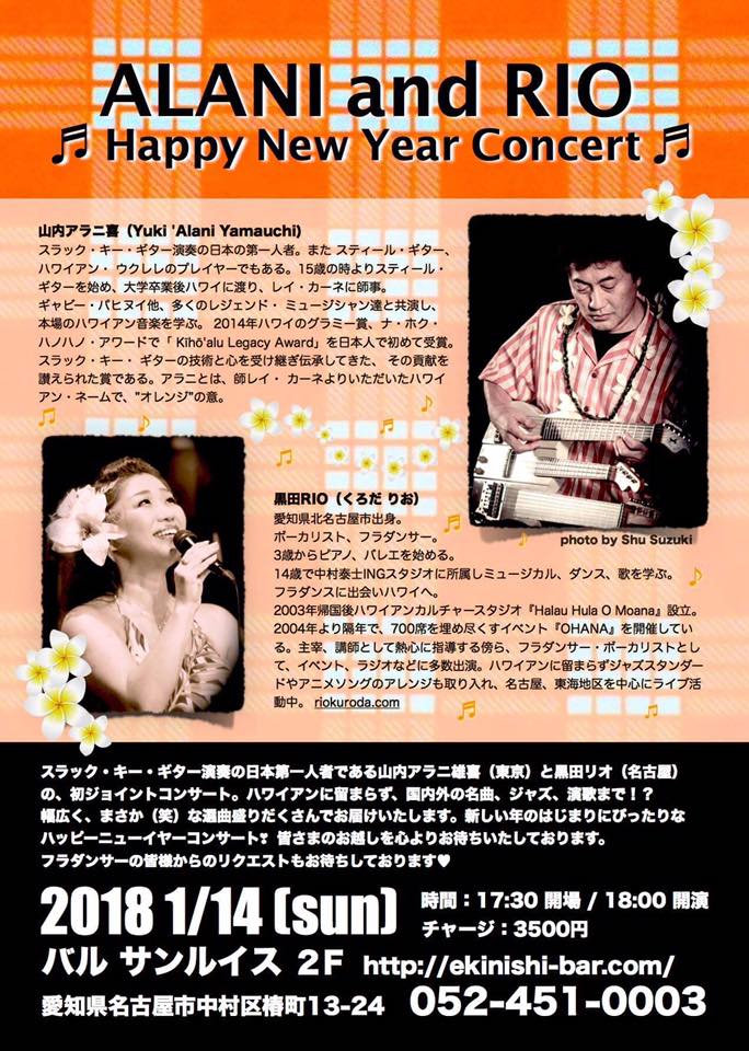 スラック・キー・ギター演奏の日本第一人者である山内アラニ雄喜(東京)と黒田リオ(名古屋)の初ジョイントコンサート。